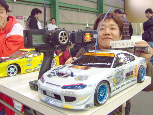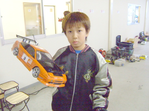 | この日のラジコンドリフト大会優勝者は、奈良県から来ていた青の15さんでした。 なんと黒井君の厳しい審査の中、3回も100点(満点)を叩き出していました 飛距離、角度、ライン 完璧でした。 |
