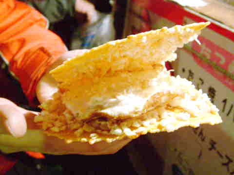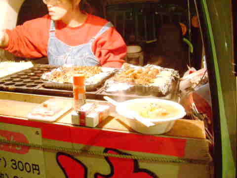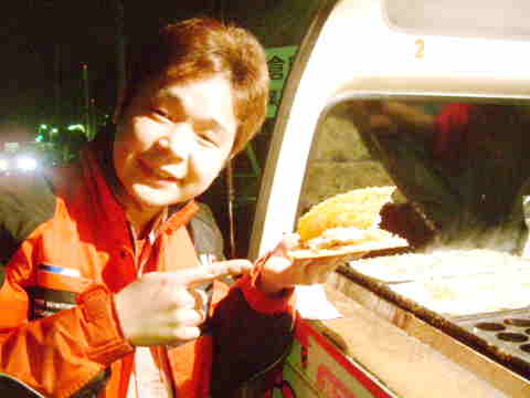 | たこ焼き屋さんのサブメニュー、焼き鳥(一本50円)・・・豚汁(一杯200円)・・・そしてついに待望の新メニューは、 たまごサンドたこせん。 | |