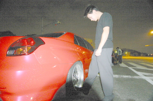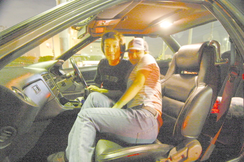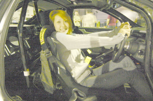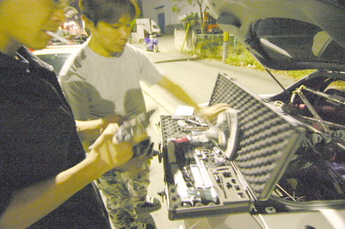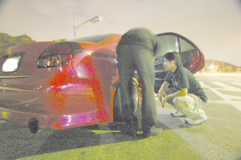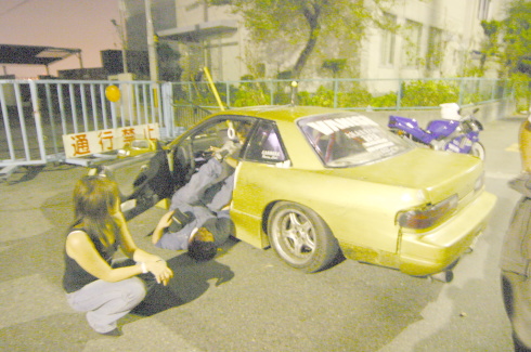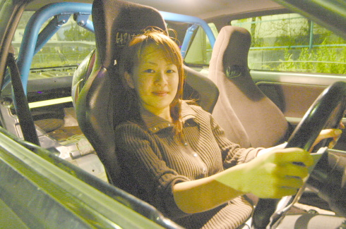 | ドアを開けてなにやらフェンダー加工の細かい所をチェックする織ちゃん。 今回、織ちゃんの評価は、50点。なかなか厳しい点を指摘していた。 |