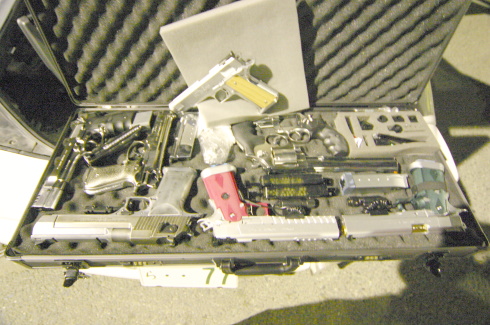 | 自慢のモデルガンを披露する、ソルジャー橋口 これだけでもガンコレクションのほんの一部 | |