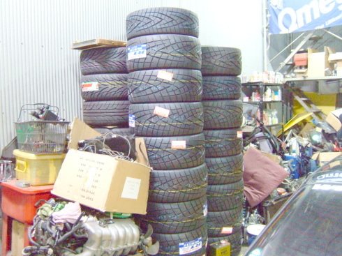 | タイヤメーカーのスポンサーがついた為、店中タイヤがいっぱい 一回のD1参戦で20本以上使ってしまいます。 (コース3週=9コーナーでリアーの新品タイヤ終わります。) |