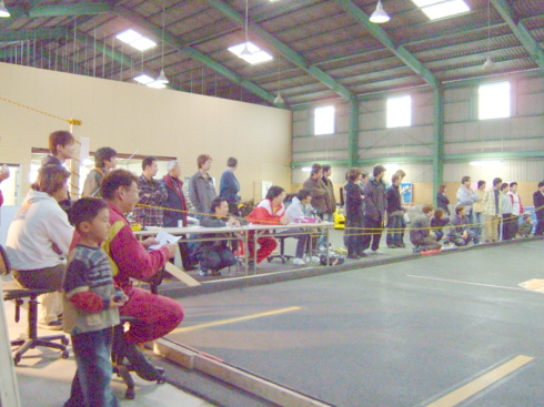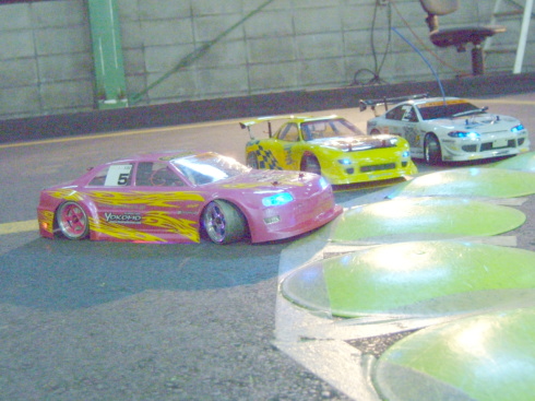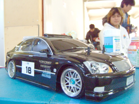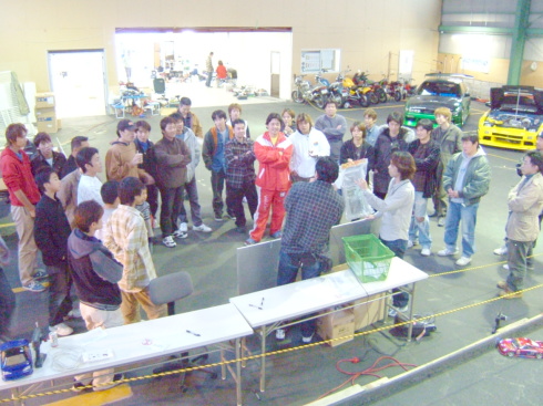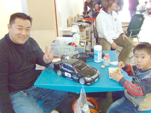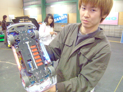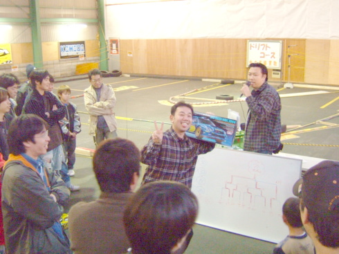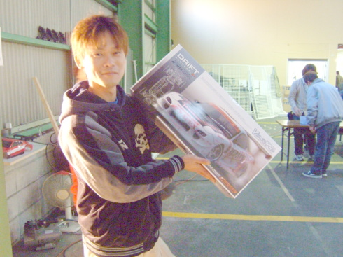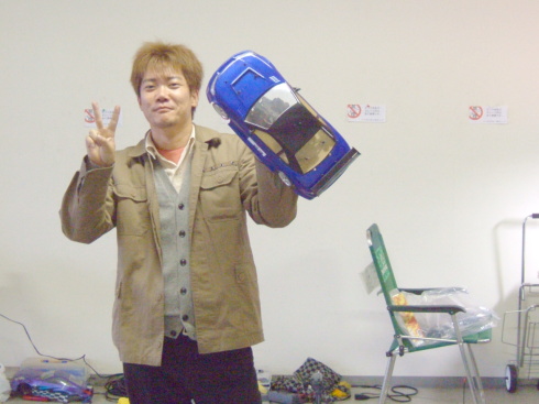 | この日のラジコンドリフト大会優勝者は、奈良県から来ていた青の15さんでした。 なんと黒井君の厳しい審査の中、3回も100点(満点)を叩き出していました 飛距離、角度、ライン 完璧でした。 |