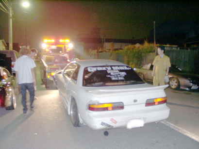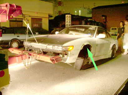 クレイジーマックス所属のぼり君、撃沈、緑の矢印の所から助手席が見えていた(∩.∩)