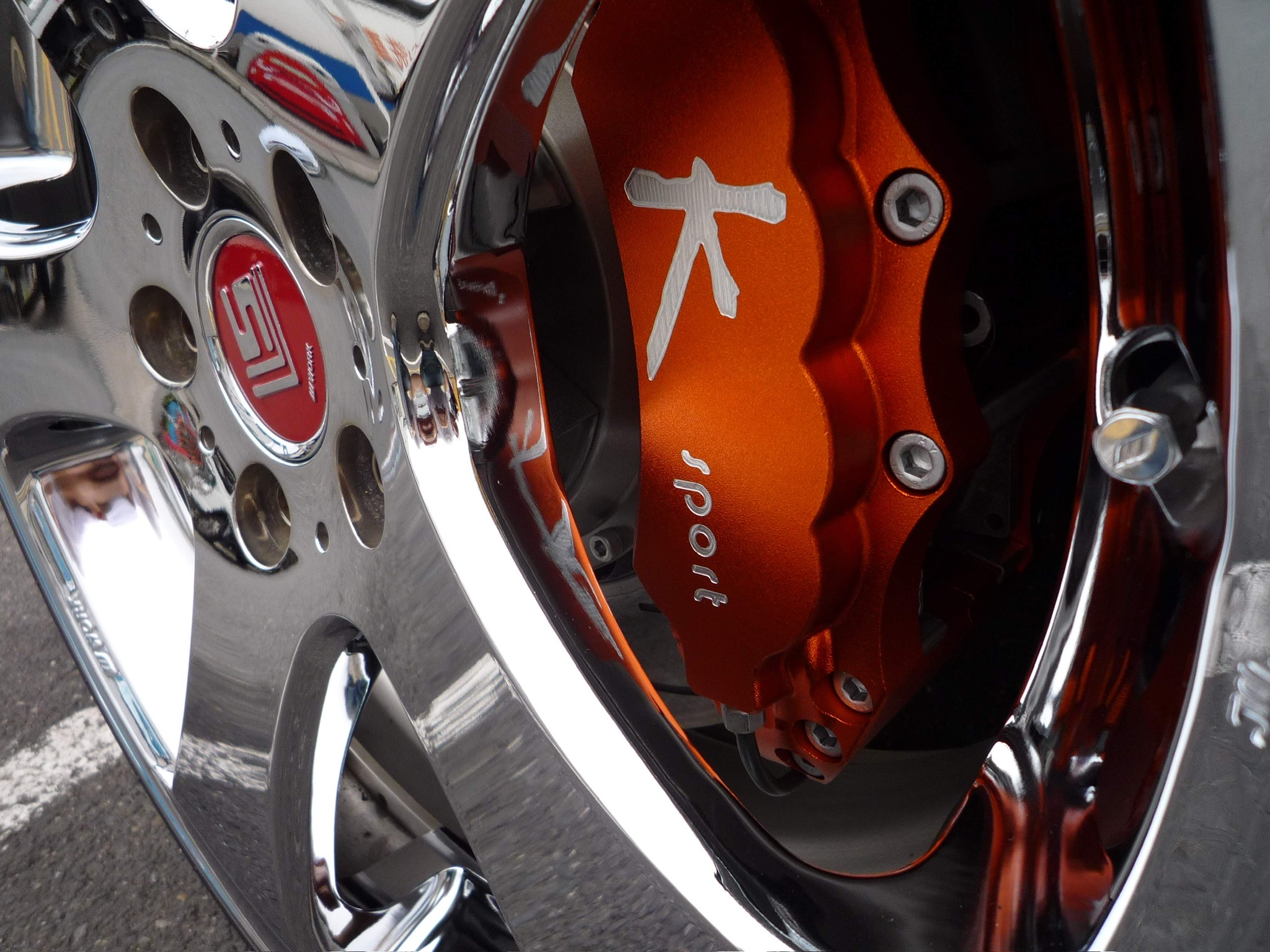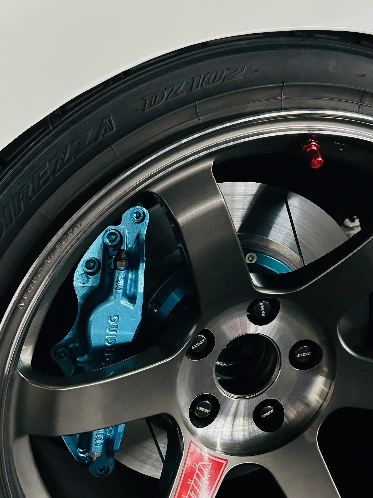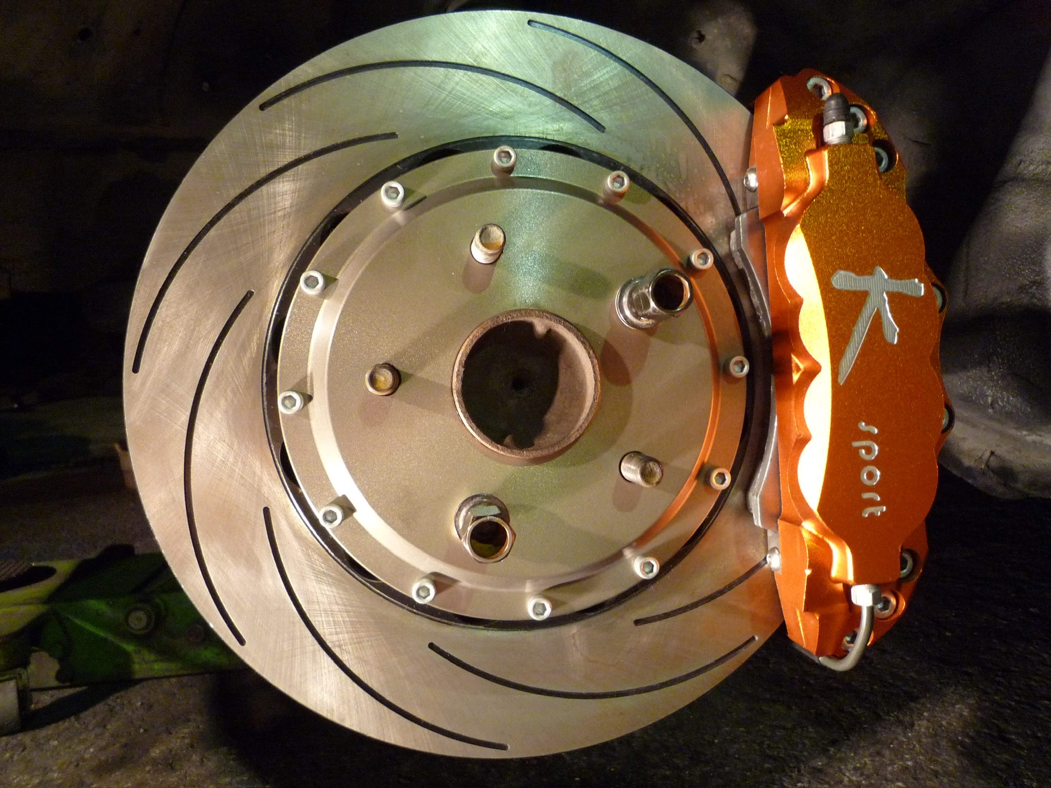 バネ下重量を軽減するため、ブレーキキャリパーは